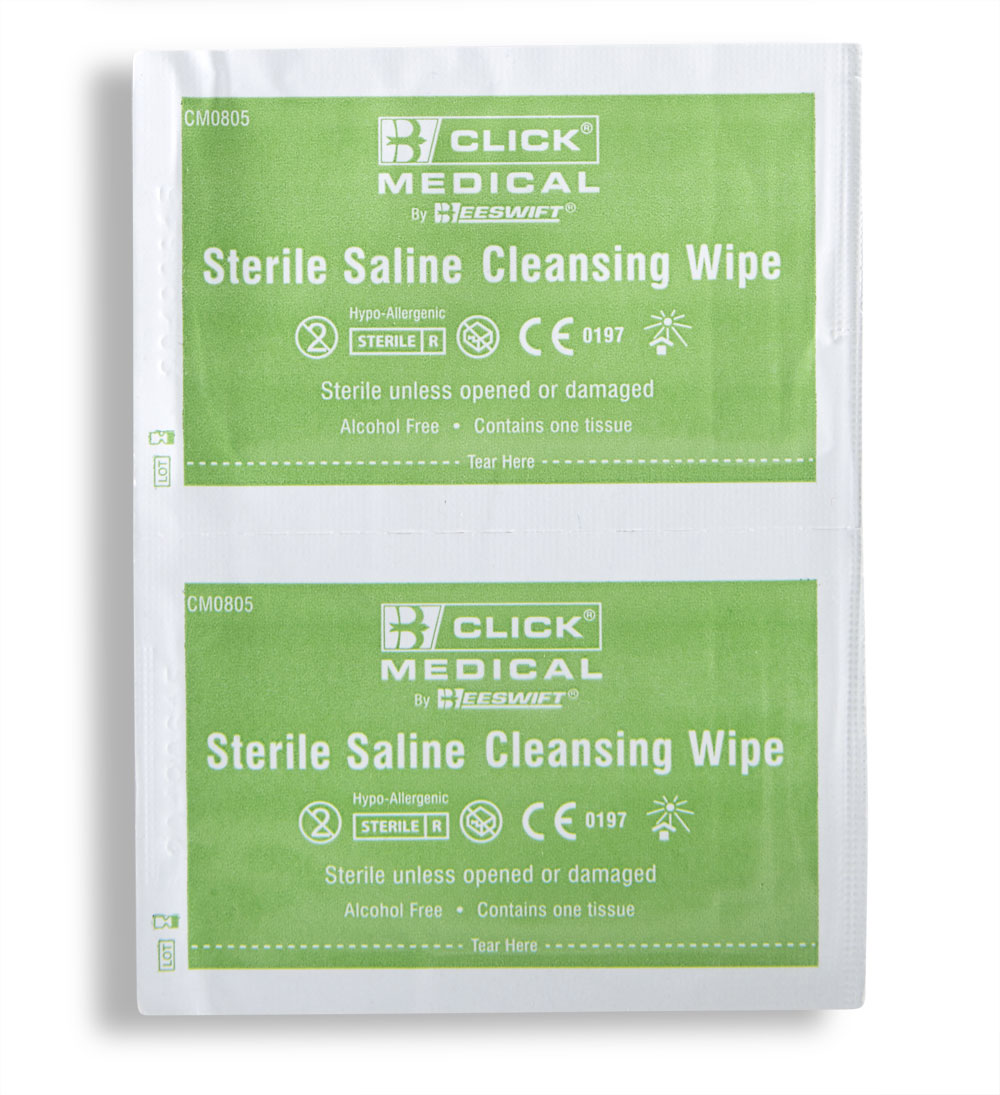 Individually sterile wrapped and CE marked saline cleansing wipes
