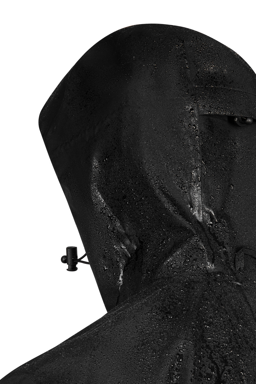 Ergonomic hood with vertical and horizontal drawstring adjustments and stiff hood peak
